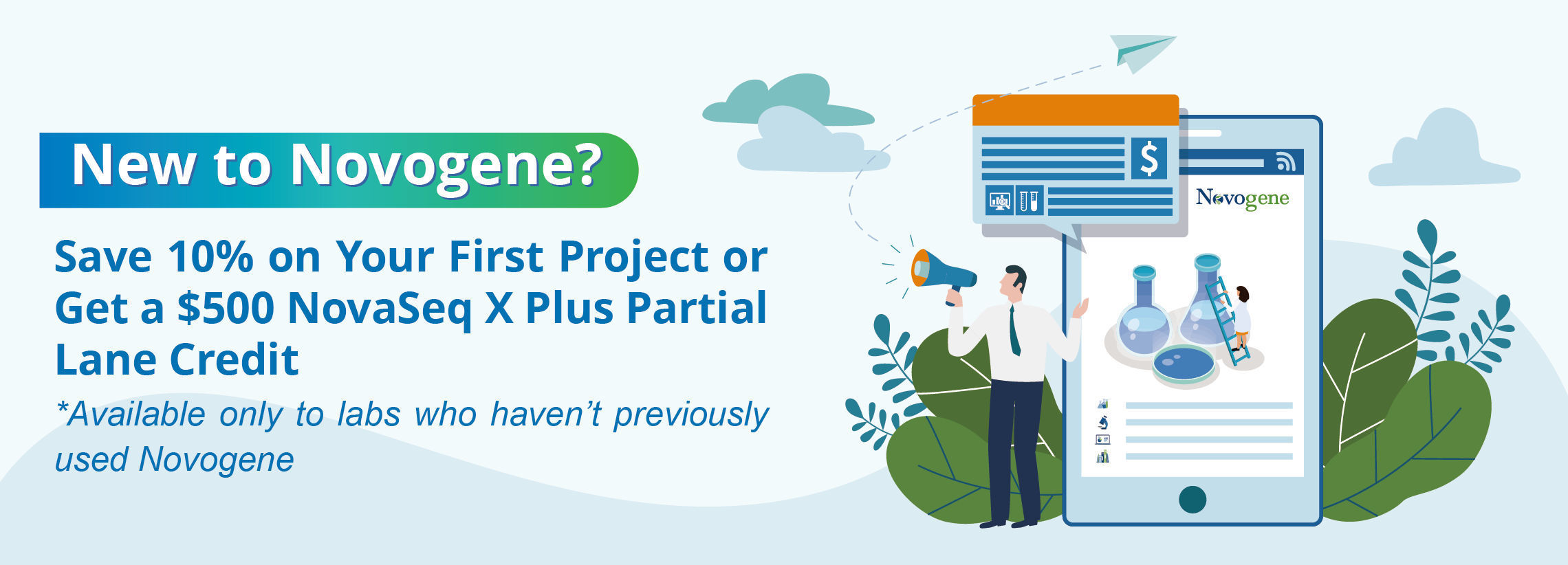 Try our NovaSeq X Plus partial lane sequencing with a minimum project value of $500 on your first project and earn a $500 credit toward your next project. This one-time credit can be applied to any service and can be redeemed within one month of completing the initial project, on a subsequent project valued at more than $1,000. Use this opportunity to explore more of our services and add value to your research with Novogene's advanced solutions.