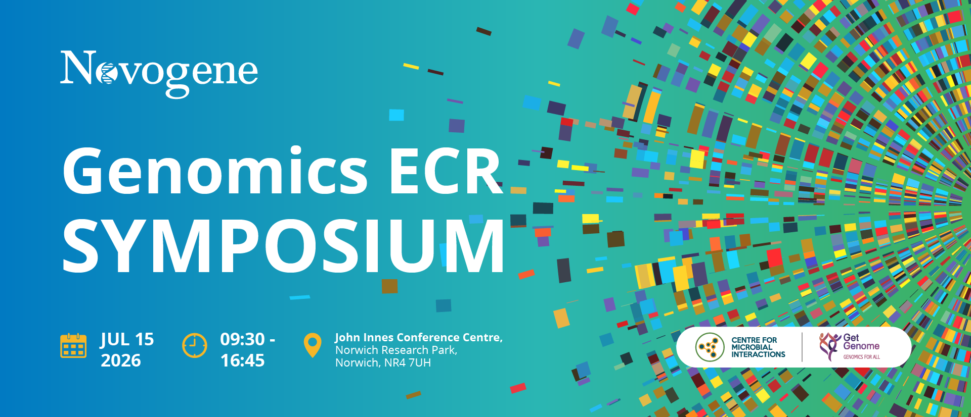 We are excited to invite you to the The Microbial Genomics ECR Symposium, organised by the Centre of Microbial Interactions, GetGenome and Novogene, taking place on Wednesday, 15th July 2026 at the John Innes Conference Centre.