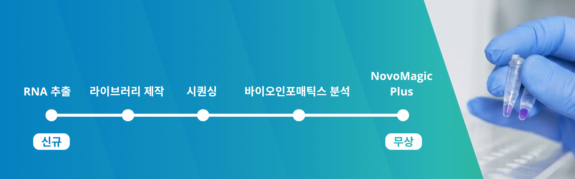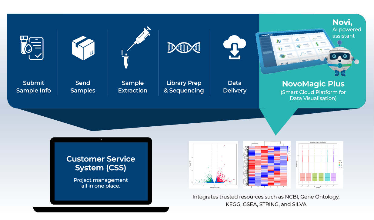 인간및 동물의 조직, 셀 펠렛(Cell pellets), 혈액, 식물 등 다양한 샘플의 고품질 RNA 추출부터 NovoMagic Plus플랫폼를 통한 바이오인포매틱스 분석에 이르기까지, 저희의 엔드투엔드 솔루션이 각 단계를 일관성 있게 연결하고 신뢰성을 보장합니다.