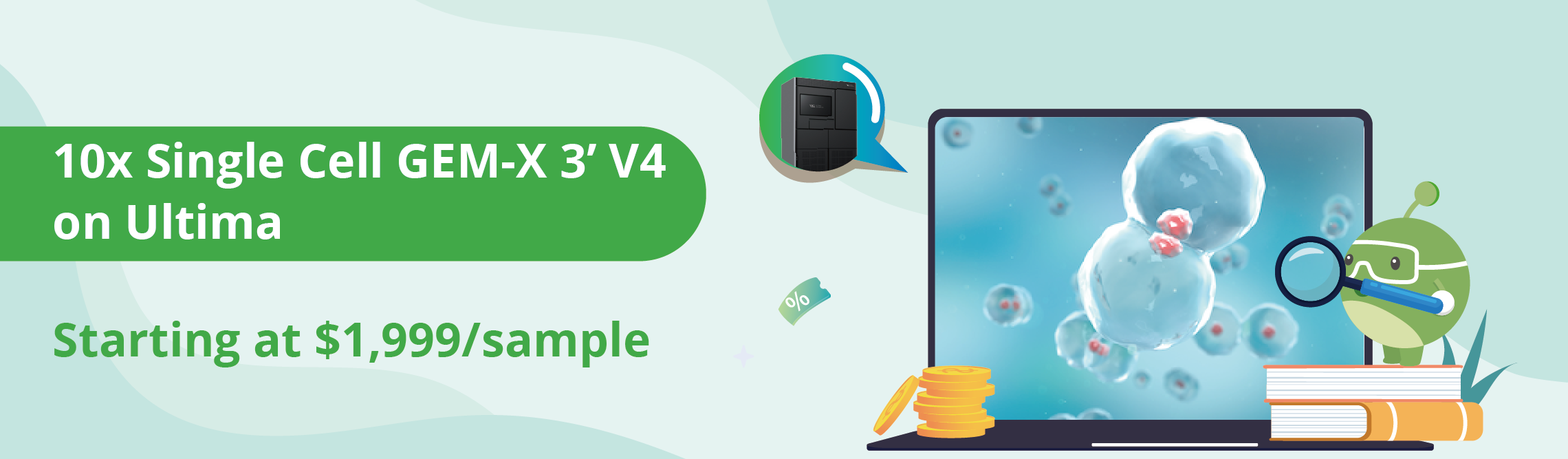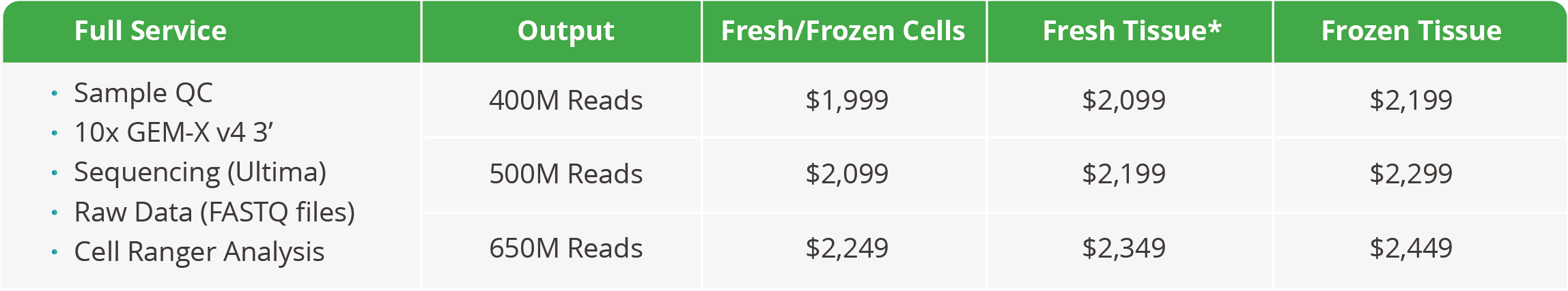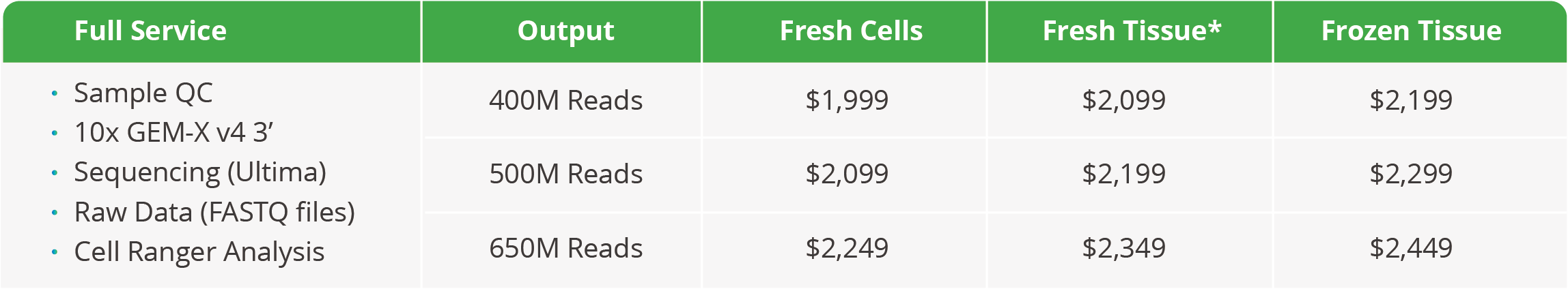 Service Bundle: Promotional pricing is a comprehensive package including Sample QC, Library Preparation (10x GEM-X 3’ v4), Sequencing (UG), and Cell Ranger Bioinformatics analysis.