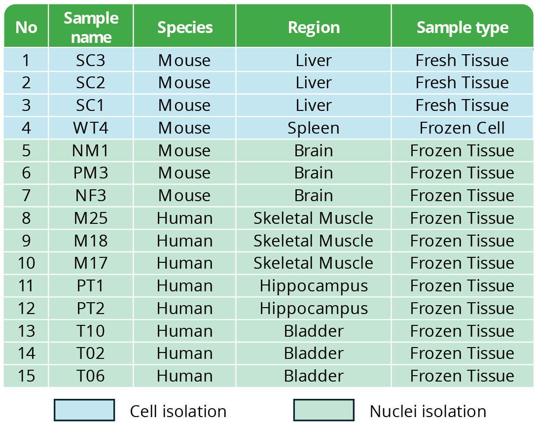 Sample Type: For fresh tissue, we currently accept Human/Mouse: Liver, Brain, Tumor (brain/lung/colorectal/ovarian/ gastric tumor), Spleen, Skin, Intestine. For other tissue types, please consult the Novogene team.