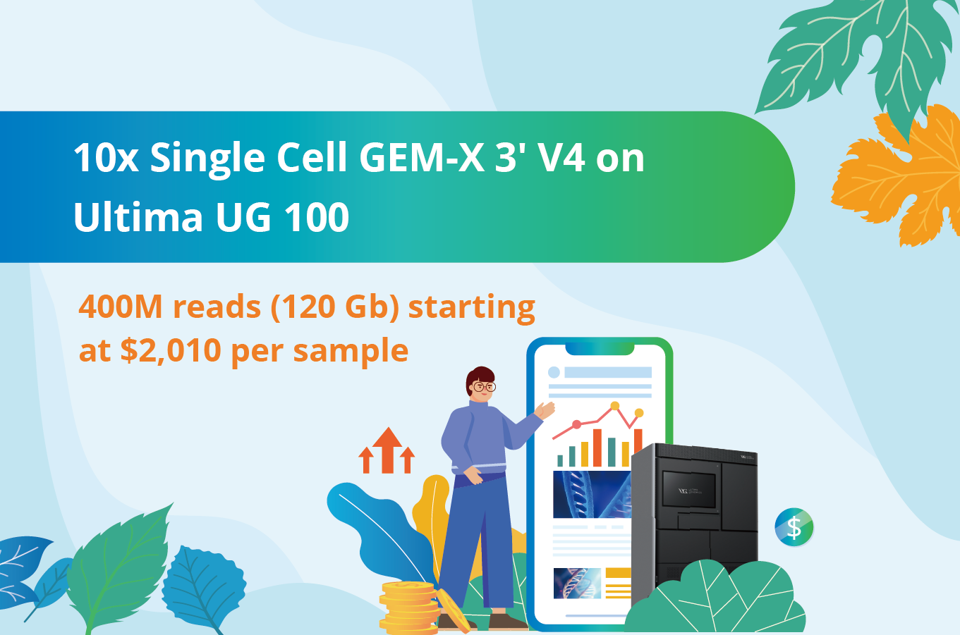 Unlock the power of 10x Genomics Single Cell 3′ v4—now seamlessly integrated on the Ultima Genomics platform. Scale confidently from 400M reads (120 Gb) with Free Cell Ranger, delivering lower costs without compromising data quality.