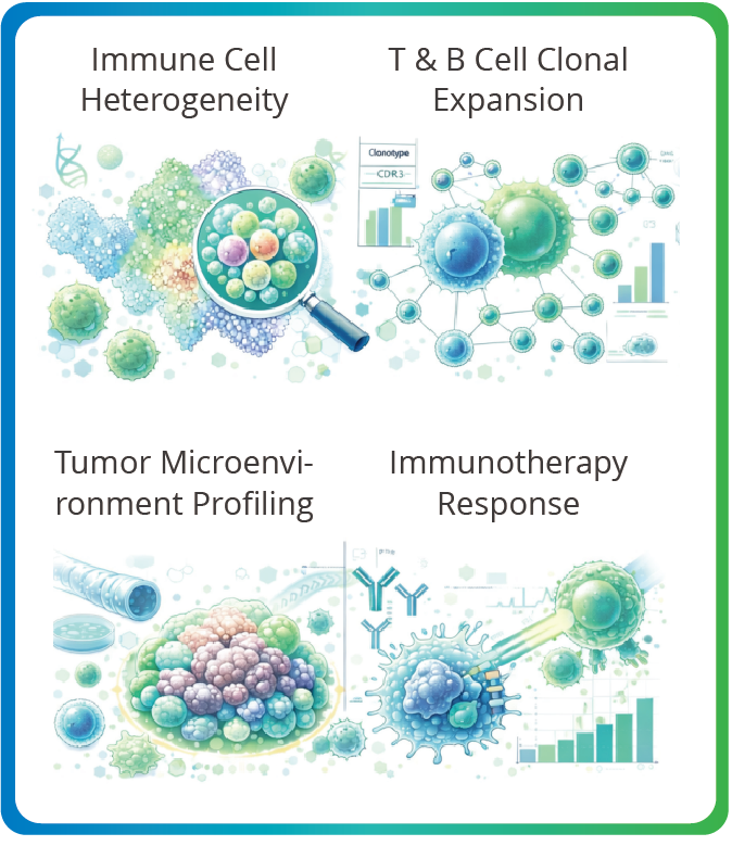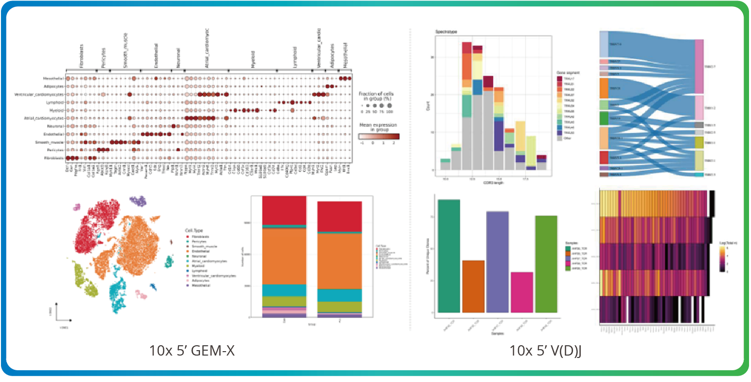 We provide end-to-end 10x Genomics single Cell 5’ Gene Expression & V(D)J (TCR/BCR) profiling services. Enabling simultaneous analysis of transcriptome and immune receptor clonotypes at single-cell resolution.