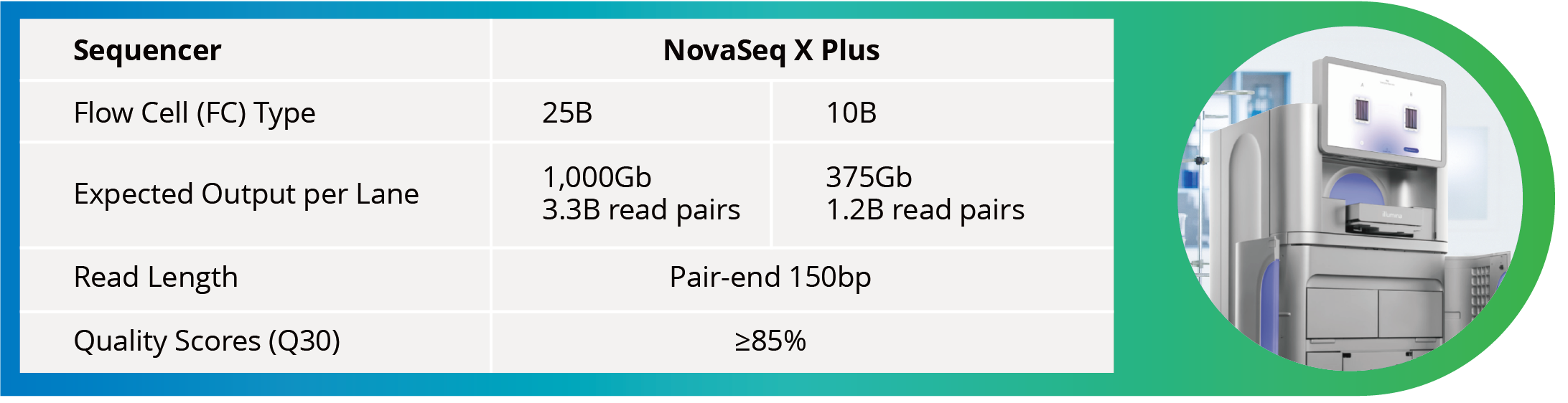 Take advantage of the lowest sequencing costs, on a per read/Gb basis, with a guaranteed Q30 score ≥ 85%.