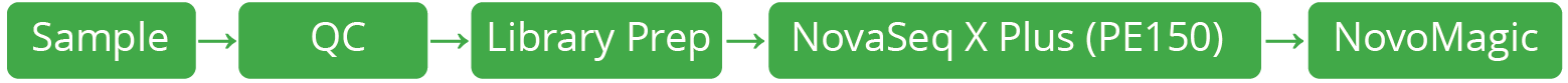 Included at $200/sample: QC + Library Prep + 9Gb paired-end 150bp (PE150) on Illumina NovaSeq X Plus.(Bioinformatics are optional add-ons.)